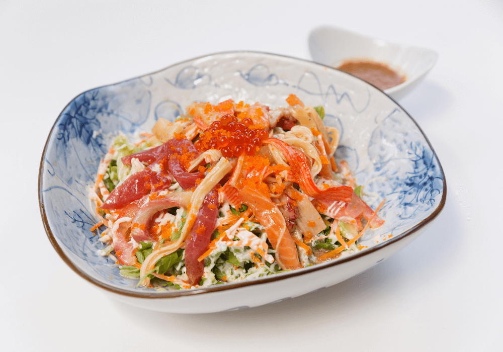 Cuối cùng, bạn cho salad ra dĩa và để sashimi cá hồi, sashimi cá ngừ và trứng cá chuồn, trứng cá hồi lên trên là hoàn tất.