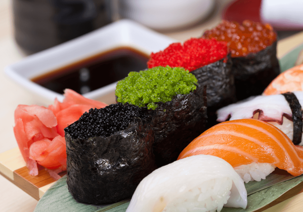 Bọc lá rong biển nori viền xung quanh viên cơm sushi với mặt bóng hướng ra ngoài. Cuối cùng thêm 1 thìa trứng cá chuồn lên trên là hoàn thành, ngon hơn khi ăn kèm nước tương và gừng hồng.