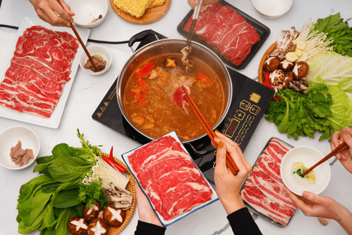 Lẩu ba chỉ bò thập cẩm: Thịt ngọt thanh, kết hợp rau củ, nấm, nước lẩu đậm đà.