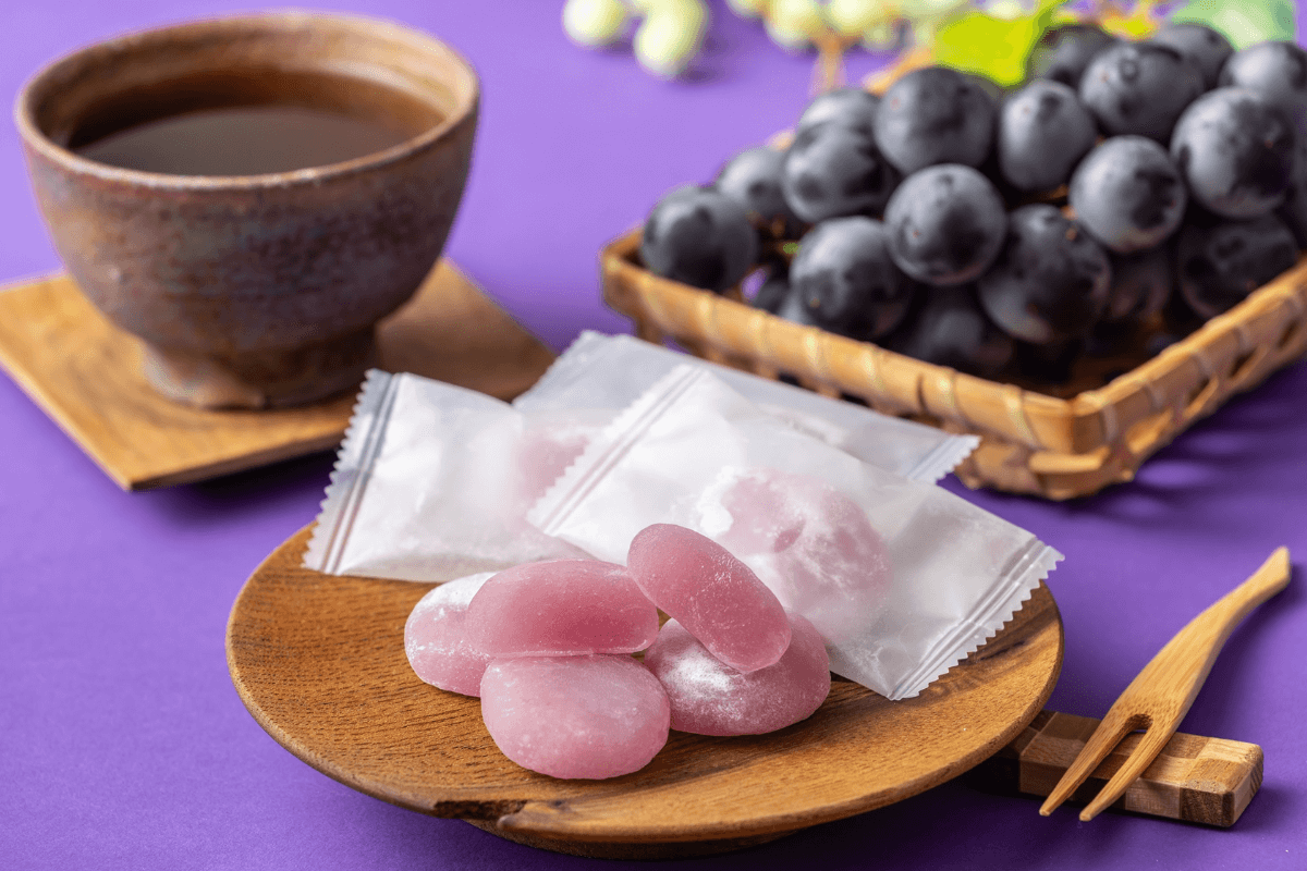 Thành phần: Nước mạch nha (sản xuất trong nước Nhật), đường, bột gạo nếp, tinh bột, nước ép nho Kyoho, chất nhũ hóa, hương liệu, chất tạo màu (anthocyanin), có chứa một phần thành phần từ sữa.