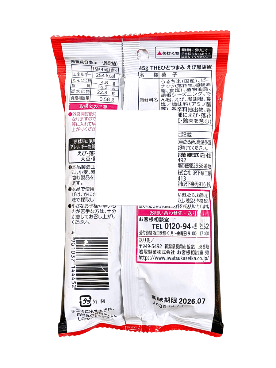 Thành phần: Gạo nếp 70%, đậu phộng, dầu thực vật (dầu cọ), muối; tôm 7%, tiêu đen 5%, gia vị tiêu 3%; chất điều vị (INS621) và một số phụ gia/chiết xuất gia vị theo nhãn (có thể chứa: tôm, bột mì, sữa, đậu phộng, mè, đậu nành, thịt gà, thịt heo, gelatin)