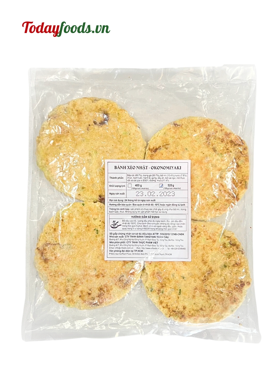 Bánh xèo Okonomiyaki được đóng bịch 520g bao gồm 4 cái có thể dùng được cho từ 1~2 người, đã được chế biến sẵn, vô cùng tiện lợi, bạn chỉ cần mất khoảng 5 phút chiên giòn là có thể ăn được ngay một dĩa okonomiyaki thơm nóng.