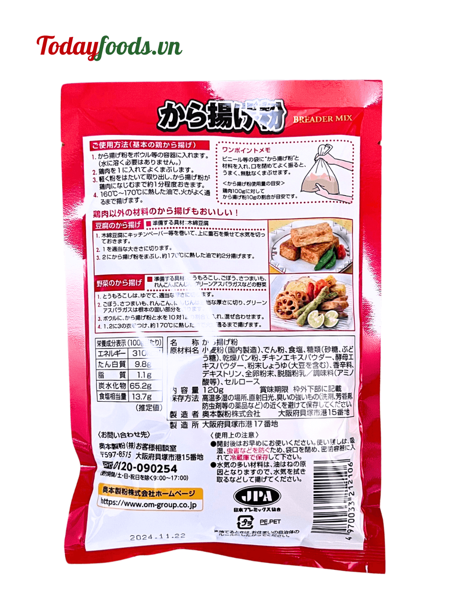 Thành phần: Bột mì (sản xuất trong nước), tinh bột, muối, đường, đường, glucose, vụn bánh mì khô, bột chiết xuất từ thịt gà, bột chiết xuất men, nước tương bột, gia vị, dextrin, bột trứng, sữa bột gầy.