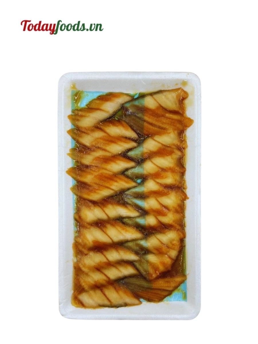 Anago hay còn gọi là cá chình biển, được làm sạch, tẩm ướp sauce, cắt lát, 1 khay có 20 miếng, 1 miếng 6g, tiện lợi và dễ sử dụng, không cần tẩm ướp thêm bất cứ gia vị nào nữa.