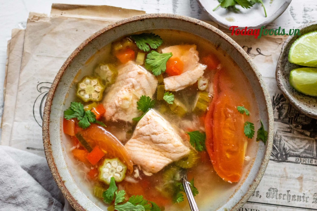 - Bước 3: Đun sôi cho phần thịt cá hồi xắt lát vào. Nêm 1 muỗng canh knorr, 1 muỗng, dùng gói gia vị nêm canh chua sẵn (bạn có thể tìm mua ở các cửa hàng tiện lợi). Tiếp đó cho phần đậu bắp, bạc hà vào, 1 muỗng nước mắm. Do giá nhanh chín nên cho vào sau cùng. Không thể thiếu ngò gai.