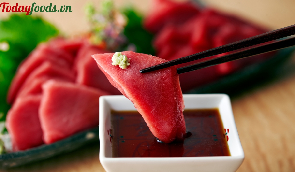 - Chấm cá ngừ với nước tương chuyên sashimi hoặc và mù tạt tươi để tăng thêm hương vị cho món ăn.