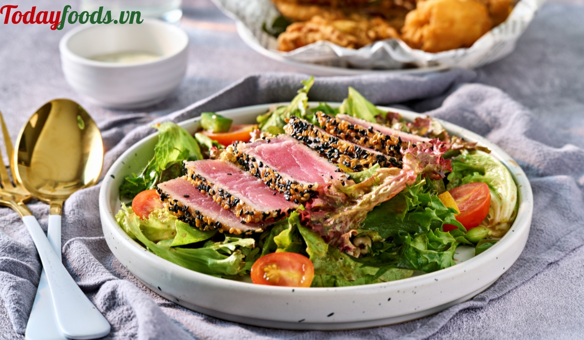 - Áp chảo cá ngừ với dầu olive ở lửa vừa. Chỉ áp chảo mỗi mặt khoảng 30 giây hoặc tùy theo độ chín mong muốn.