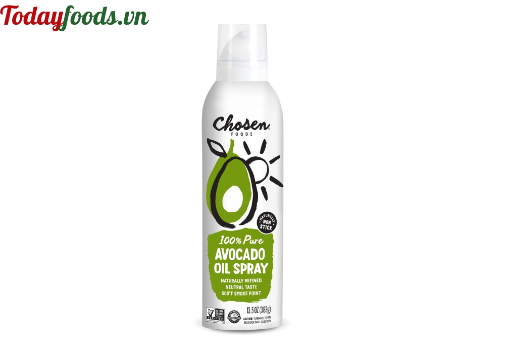- Dầu bơ Chosen Foods có thiết kế dạng xịt thông minh, giúp bạn điều chỉnh được lượng dầu cần thiết mà không gây lãng phí. Sản phẩm còn có tính năng chống dính chảo, dễ dàng chùi rửa sau khi sử dụng.