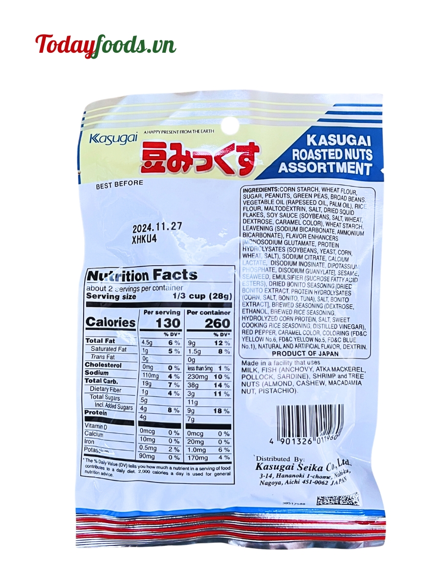 Đậu thập cẩm Kasugai là một loại snack đến từ Nhật Bản, có hương vị đa dạng và hấp dẫn. Sản phẩm được sản xuất trên dây chuyền công nghệ cao, đảm bảo tiêu chuẩn chất lượng từ nguyên liệu đến thành phẩm.