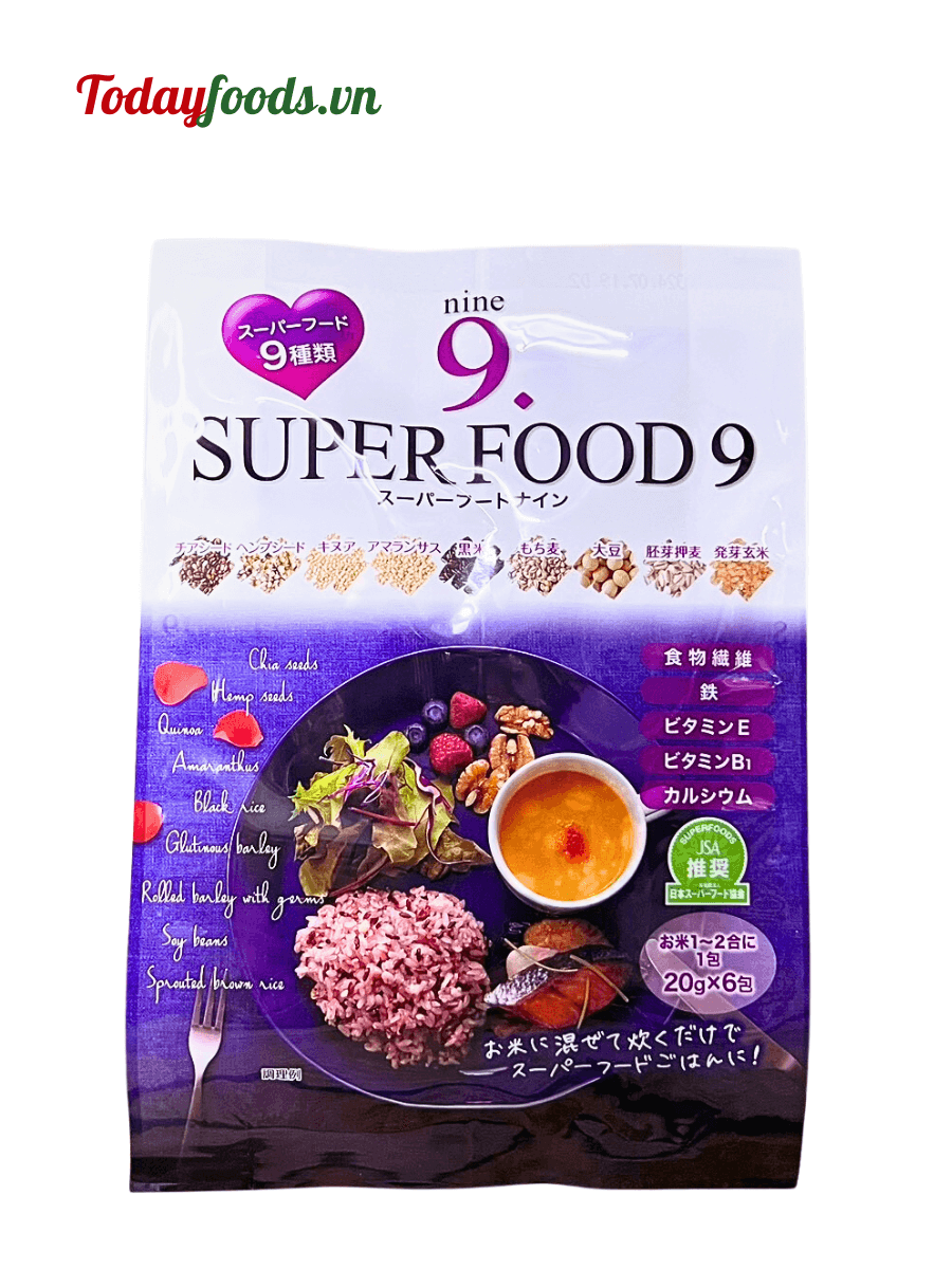 Thành phần: bao gồm 9 loại hạt ngũ cốc: lúa mạch nghiền, gạo đen, hạt diêm mạch Quinoa, hạt Chia, gạo lứt, lúa mạch nếp, hạt cây dền, hạt cây gai dầu, đậu nành.