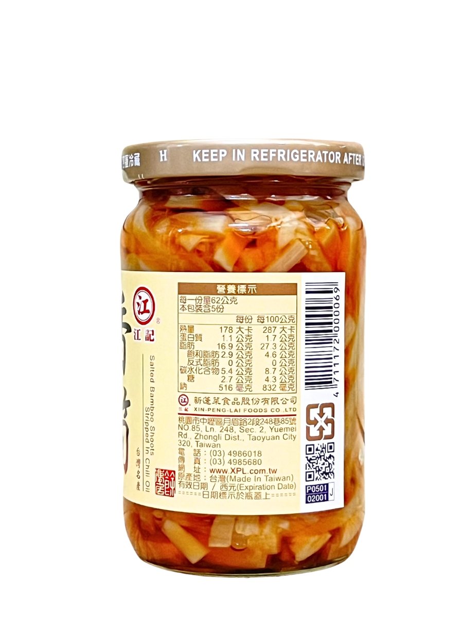 Thành phần: Măng thái nhỏ, dầu đậu nành, tương ớt, hương liệu, chanh, đường, dầu mè, muối, bột ớt đỏ tự nhiên (dầu hoa), bột hồi, bột tiêu trắng.
