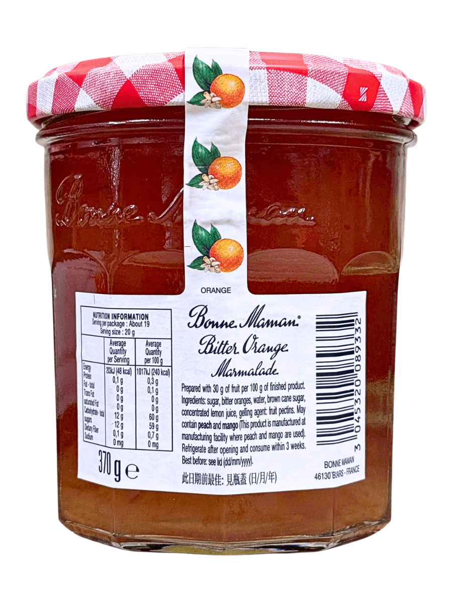 Thành phần: Đường, cam, đường mía, nước chanh cô đặc, chất tạo gel (pectin trái cây).