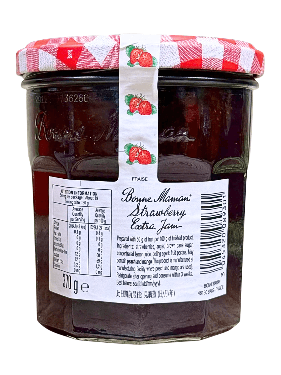 Thành phần: Dâu, đường, đường mía, nước chanh cô đặc, chất tạo gel (pectin trái cây).