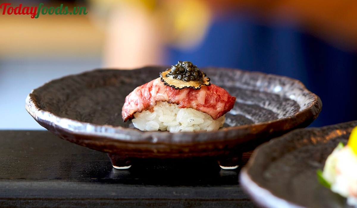 Nigiri Sushi là một món ăn đặc trưng của Nhật Bản, được làm từ cơm trộn giấm, cá sống và wasabi. Nếu bạn muốn nâng cao trải nghiệm ẩm thực, bạn có thể thử kết hợp Nigiri Sushi với thịt bò Wagyu và trứng cá tầm Caviar. Đây là một sự kết hợp tinh tế và xa xỉ, thậm chí giới thượng lưu nhiều người họ còn rắc thêm vàng lên món ăn. Bạn sẽ cảm nhận được sự hòa quyện giữa vị ngọt của cơm, vị béo của thịt bò, vị mặn của trứng cá tầm.