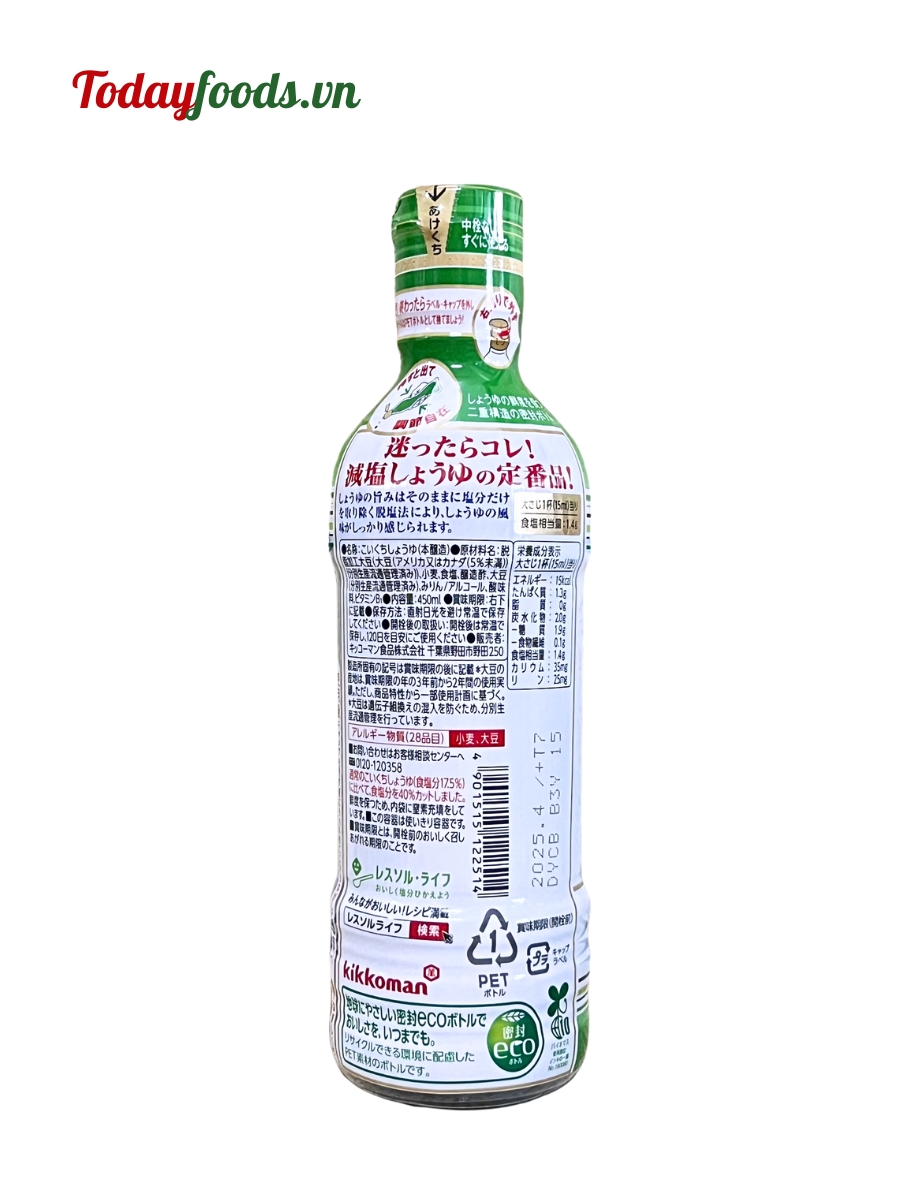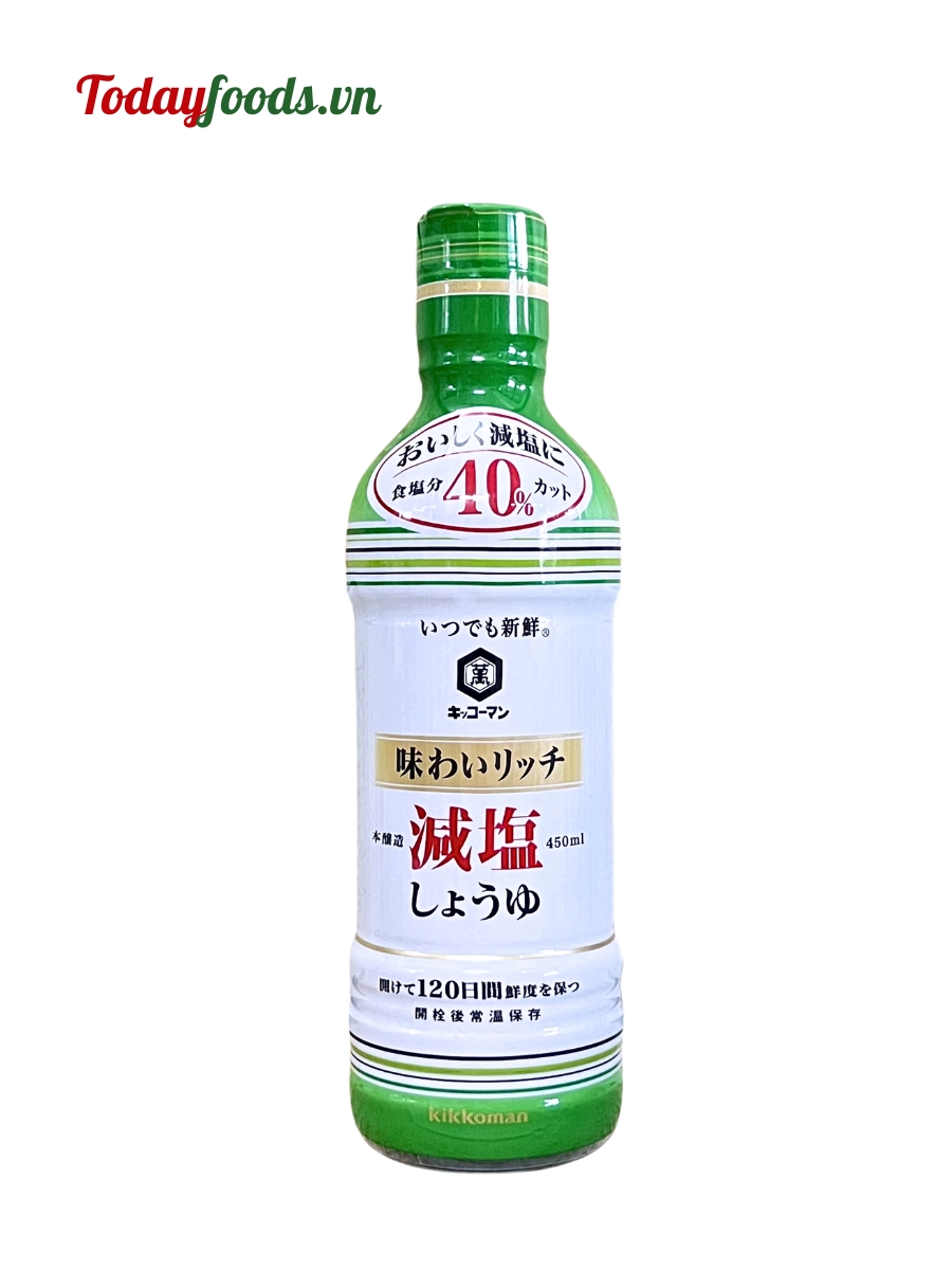 Nước tương Kikkoman giảm muối 40% là phiên bản nước tương đặc biệt, được giảm muối để tốt hơn cho sức khỏe người dùng. Vẫn giữ được hương vị đậm đà và mùi vị thơm ngon từ đậu nành lên men tự nhiên, nước tương Kikkoman giảm muối 40% còn được pha trộn thêm với mirin để tạo độ ngọt tinh tế.