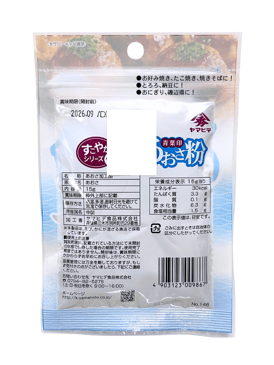Rong biển vụn Aosa Yamahide 15g là rong biển xanh dạng vụn/bột, có hương thơm biển nhẹ, thường dùng để rắc lên các món Nhật như takoyaki, okonomiyaki, yakisoba, cơm, mì hoặc đậu hũ.
