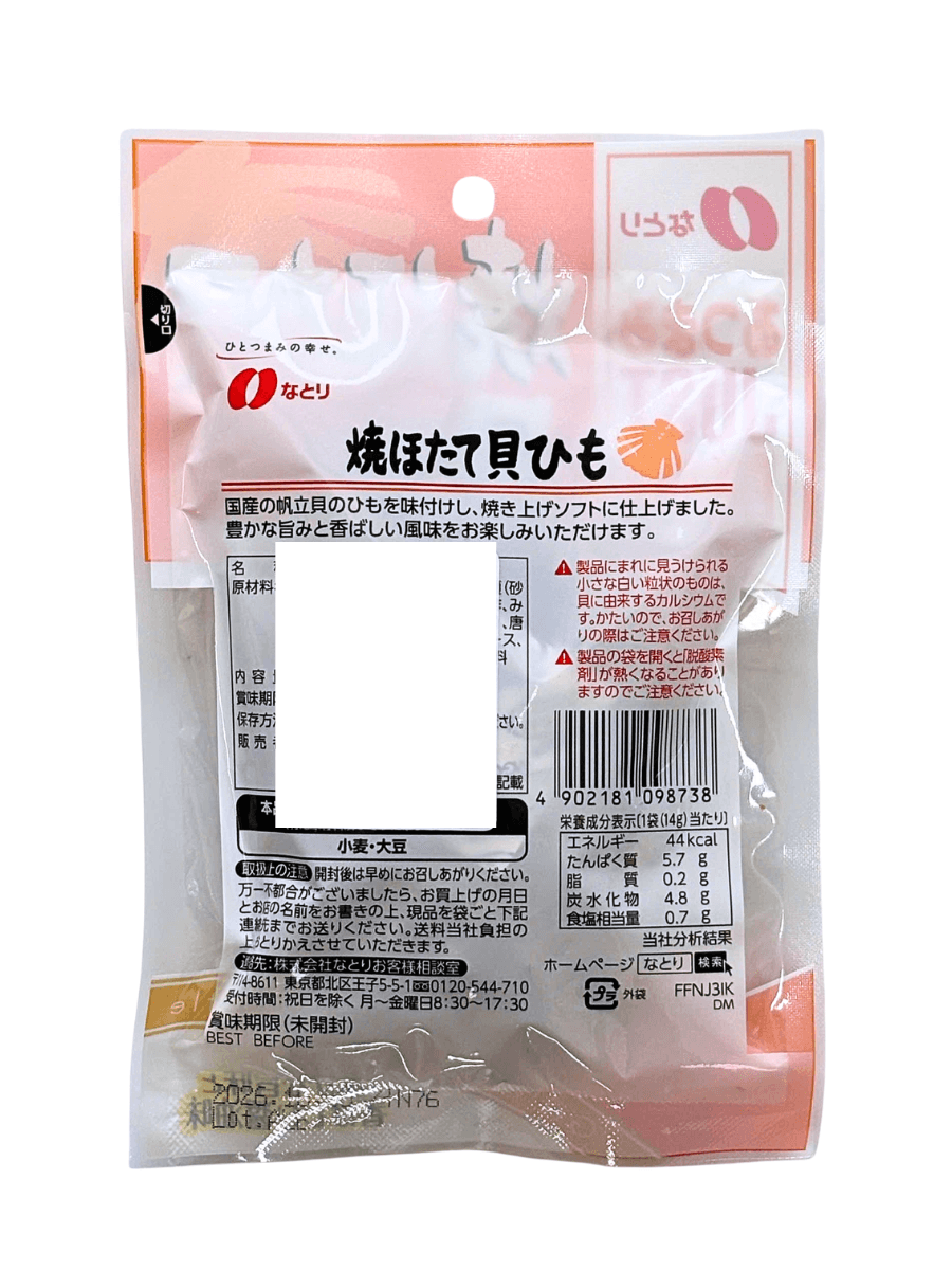 Thành phần: Sò điệp 85% (thịt viền), đường (đường cát, glucose), rượu sake, muối ăn, giấm lên men, rượu gia vị (rượu, gạo, muối, men koji), nước tương (lúa mì, đậu nành, nước, muối), ớt (chất tạo ngọt INS420(i)), đường trehalose, gia vị (axit amin), hương liệu tổng hợp, chất điều chỉnh độ acid (INS330)