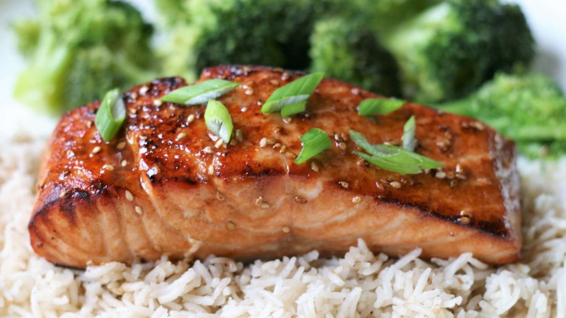 - Cá hồi sốt Teriyaki: Cá hồi áp chảo hoặc nướng kèm sốt Teriyaki.