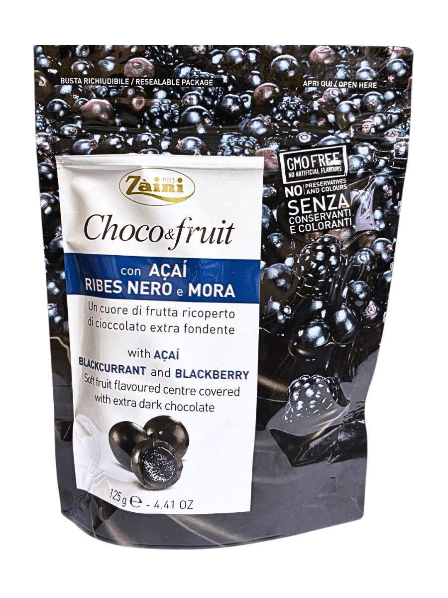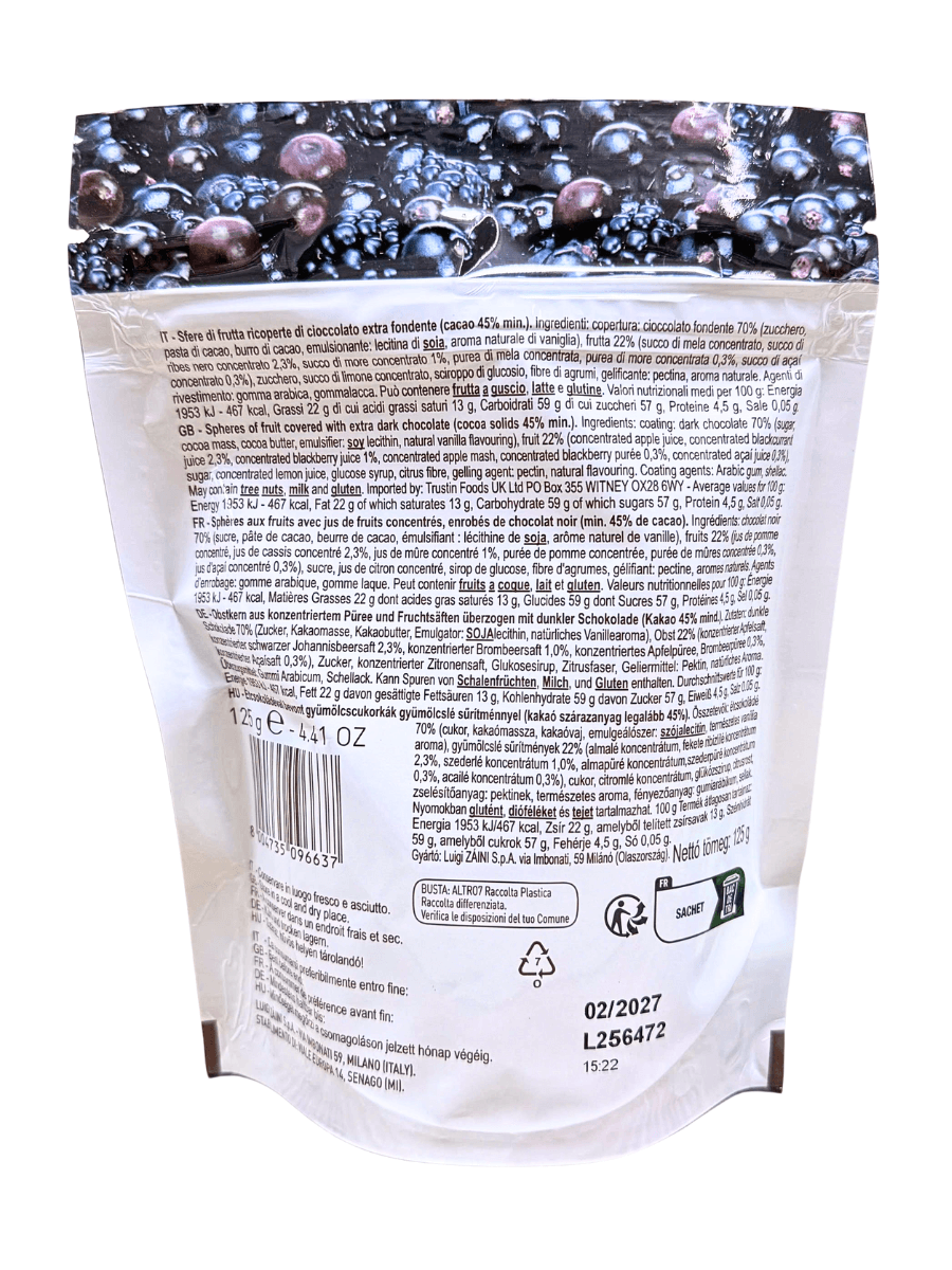Thành phần: Socola đen 70% (đường, khối cacao, bơ cacao, chất nhũ hóa: lecithin đậu nành, hương vani tự nhiên); trái cây 22% gồm nước táo cô đặc, nước ép lý chua đen cô đặc 2,3%, nước ép mâm xôi đen cô đặc 1%, purée táo cô đặc, purée mâm xôi đen cô đặc 0,3%, nước ép acai cô đặc 0,3%; đường, nước cốt chanh cô đặc, xi-rô glucose, chất xơ cam quýt, chất tạo gel: pectin, hương liệu tự nhiên; chất phủ: gôm arabic, shellac. Có thể chứa hạt có vỏ, sữa và gluten.