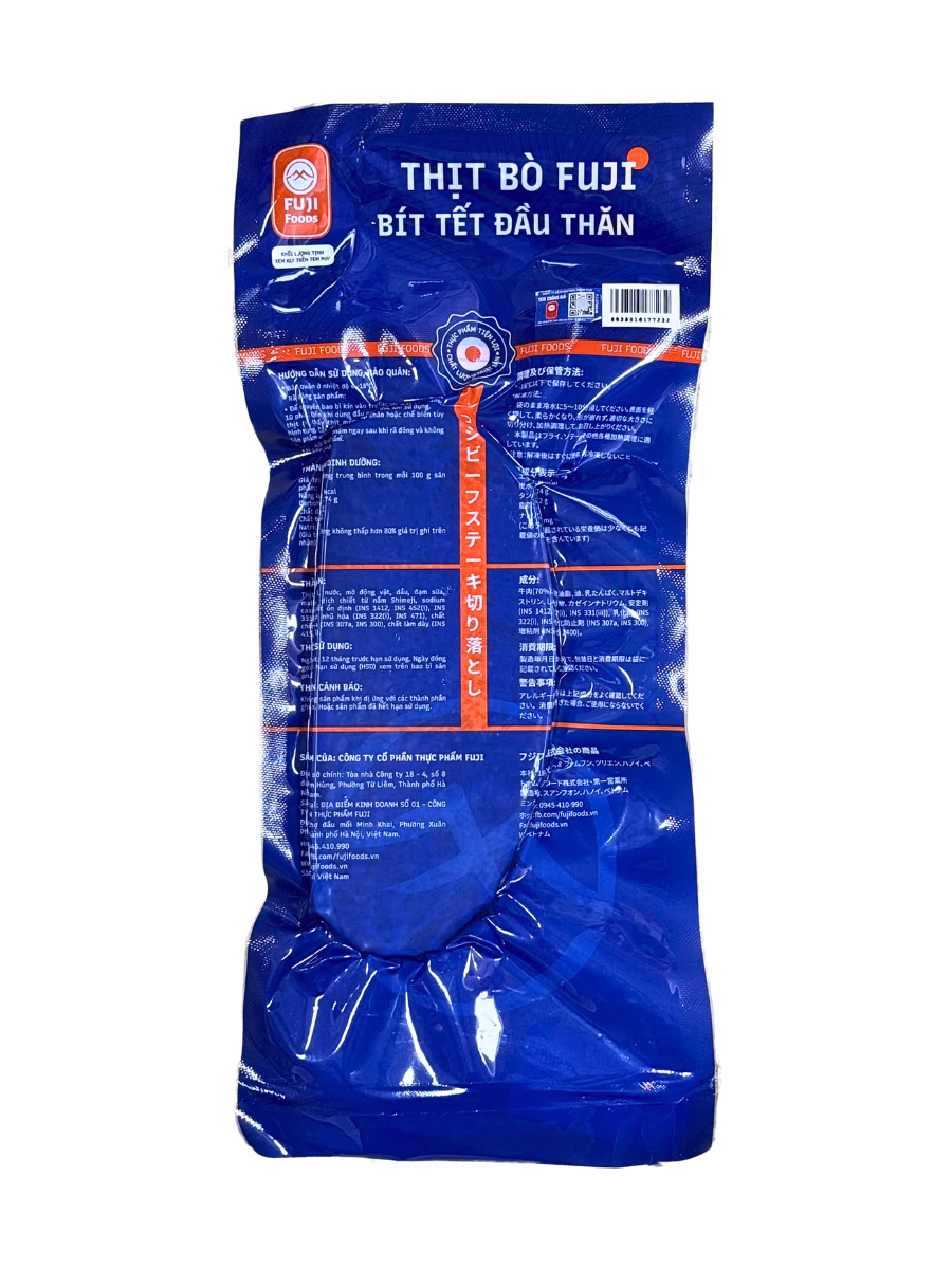 Thành phần: Thịt bò (70%), nước, mỡ động vật, dầu, đạm sữa, maltodextrin, dịch chiết từ nấm Shimeji, sodium caseinate, chất ổn định (INS 1412, INS 452(i), INS 331(iii)), chất nhũ hóa (INS 322(i), INS 471), chất chống oxi hóa (INS 307a, INS 300), chất làm dày (INS 415, INS 1400).