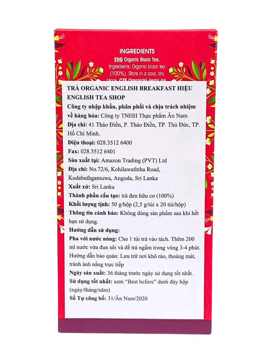 Xuất xứ: Sản xuất và đóng gói tại Sri Lanka, thương hiệu English Tea Shop (UK).