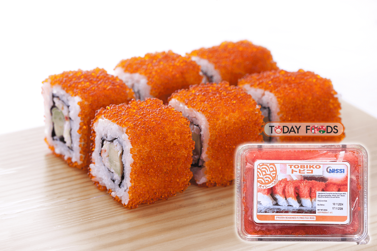 Todayfoods cam kết cung cấp trứng cá chuồn Tobiko NISSI chính hãng, bảo quản kho lạnh đạt chuẩn, giao hàng nội thành HCM nhanh chóng.