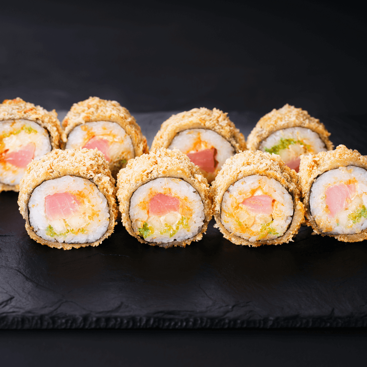 Một trong những món maki sushi độc đáo và hấp dẫn nhất chính là maki sushi trứng cá chuồn vàng chiên xù. Lớp vỏ bên ngoài của món sushi này được chiên vàng giòn rụm, kết hợp cùng hương vị ngon miệng của nguyên liệu bên trong để tạo nên một món ăn “đầy vị ghiền” thu hút sự chú ý của nhiều thực khách.