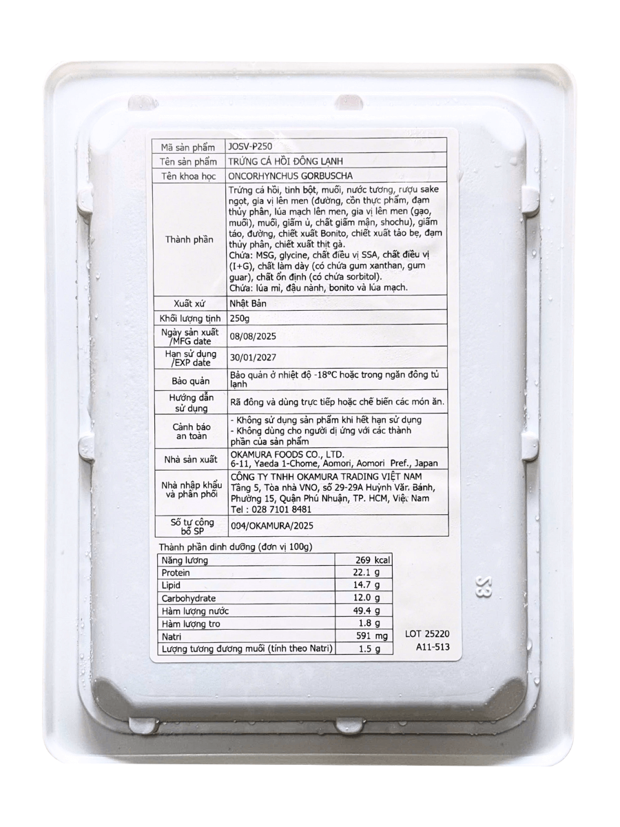 Trứng Cá Hồi Nhật Okamura 250g là dòng ikura cao cấp được sản xuất trực tiếp tại Aomori – Nhật Bản từ giống cá hồi Oncorhynchus Gorbuscha. Trứng có màu cam trong tự nhiên, vị mặn thanh, giòn tươi đặc trưng của ikura Nhật. Được nhập khẩu chính ngạch và đóng gói 250g tiện lợi, sản phẩm phù hợp cho gia đình, nhà hàng Nhật và khách sỉ HORECA.