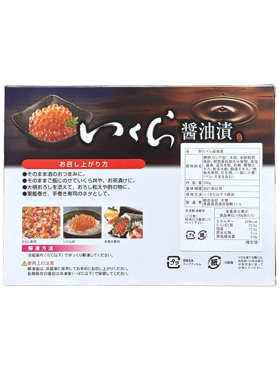 Thành phần: Trứng cá hồi, siro mạch nha, gia vị lên men từ gạo, protein thực vật thủy phân, muối, nước tương, siro đường khử, đường, chiết xuất cá bào, bột siro, chiết xuất men; chất làm đặc (đa đường), chất nhũ hóa. Dị ứng: lúa mì, trứng cá hồi, đậu nành.