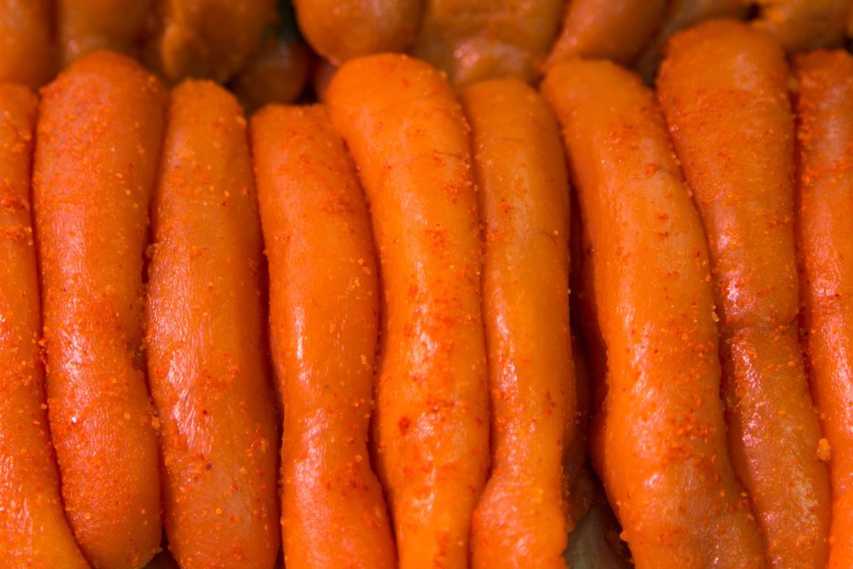 Trứng cá tuyết là một món ăn truyền thống của Hàn Quốc, được mang đến Nhật Bản bởi các thương nhân địa phương ở Kyushu. Từ những năm 1950, trứng cá tuyết đã trở thành một đặc sản nổi tiếng của vùng Fukuoka và được phát triển thành một ngành công nghiệp lớn sau Thế chiến II. Ngày nay, trứng cá tuyết muối là một món ăn phổ biến và được ưa chuộng ở Nhật Bản. Trứng cá tuyết được đóng hộp sau khi được muối để tăng khả năng bảo quản. Trứng cá tuyết muối có màu đỏ rực rỡ, được ướp với muối và ớt cay, sau đó được gia vị thêm các loại gia vị khác. Qua quá trình chế biến kỳ công, tỉ mỉ, trứng cá tuyết muối không chỉ có hương vị ngon mà còn có nhiều chất dinh dưỡng cho sức khỏe.